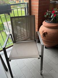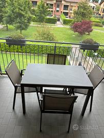 Set da pranzo per esterno da 4 persone. Composto da un tavolo rettangolare con 4 sedie coordinate. Struttura In allumino verniciato colore antracite e sedie in texitile con braccioli. Dimensioni : 120x 70x h 73. Ottime Condizioni come nuovo.