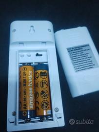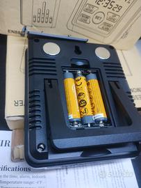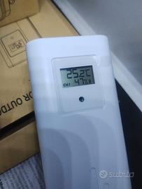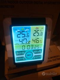 in vendita due set di igrometro e termometri digitali touchscreen e retroilluminati, possibilità di inserire avvisi acustici per temperature massime e minime, orologio, possibile di fissarli a parete, su superficie metallica grazie ai due magneti o con il loro piedistallo sulla mensola, funzionamento con 3 pile AAA, possono gestire fino a 3 satelliti, in dotazione 1 satellite appendibile a confezione totale 2 funzionamento dei satellite 2 pile AA, le pile non sono fornite.