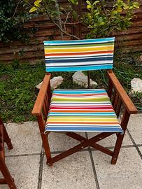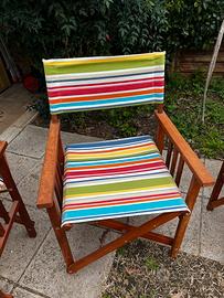 Vendo set composto da 4 sedie da regista in legno massello con seduta e schienale in tela a righe multicolor (blu, verde, giallo, arancio, rosso).