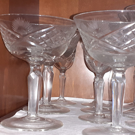 Set di bicchieri acqua,vino e spumante, con bottiglia e zuccheriera, tutto in cristallo con marchio, come nuovi