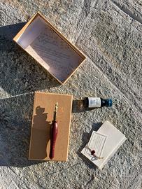 Set di kalligrafia, lavoratorio artigianale di Italia, penna in legno, inchiostro stilografico blu. Mai usato
