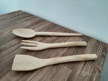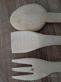 Vendo paletta, cucchiaio e forchetta di legno. Artigianali. Nuovi. Perfetti, nonostante scalfitture dovute all'intaglio manuale. Lunghezze: 33, 28 e 27 centimetri