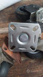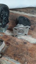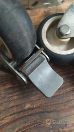 2 lotti di ruotini per pedane con due misure diverse per carichi importanti. Il lotto con i ruotini grandi non ha freni , mentre sui ruotini piccoli due hanno i freni. Qualche basetta ha una leggera patina di ossidazione