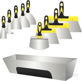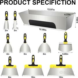 Set di 10 spatole per cartongesso: riceverai 1 spatola da 2 pollici, 1 strumento di pittura da 3 pollici, 1 coltello per giunti da 4 pollici, 1 coltello per giunti da 5 pollici, una spatola da 6 pollici (coltello per giunti)*1, un cucchiaio da secchio da 6,7 pollici*1, un coltello a nastro da 8 pollici*1, una striscia da 10 pollici Ci sono 10 Set di strumenti di diverse dimensioni (9 raschietti + 1 vassoio per stucco) per cartongesso per soddisfare le vostre diverse esigenze