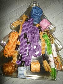 noi vendiamo una scatola con diversi fili "Perlgarn" (una confez. ha 5 g MEZ, Nr. 5, 100 % cottone, ca. 25 m, Made in Germany), in diversi colori beige/viola, giallo, ocra (in tot. 15 pz.) e anche altri fili di Anker Perlgarn Nr. 8 e Nr. 80 (solo avanzi). tutto vedi nella foto. Ideale per che ricama volentieri e ha bisogni di questi fili. Disponibile a Cà Savio a Cavallino-Treporti da subito. Tutto il SET € 25,-