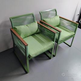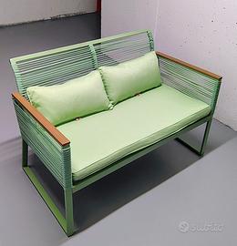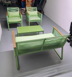 Vendo set da esterno come nuovo usato solo una stagione estiva e riposto al coperto. Il set è in acciaio verniciato e corda verde ed è formato da due sedie, un divanetto da 2 posti, ed infine da un tavolo con ripiano in vetro.
