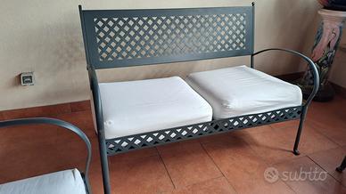 set in ferro battuto marchio italiano VerMobil modello Springtime, divanetto 2 posti misure 1,24 X 56 , n. 2 poltrone misure 61 X 56, tavolino con piano in cotto misure 78 X 78 alto 43 , cuscini in cotone bianchi sfoderabili