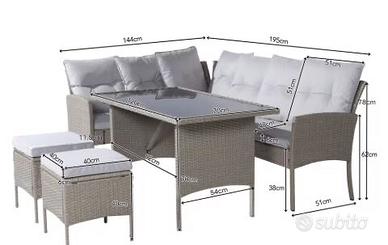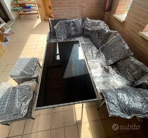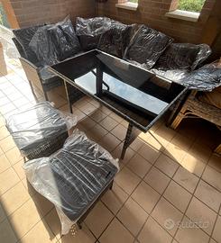Set da esterno composta da 2 divani, 2 pouf e un tavolino in poly rattan, vetro del tavolino temperato. Nuovo, con cuscini ancora sotto vuoto, mai usato. Cuscini con fodere removibili con tessuto antiacqua. Le misure dei componenti li trovate scorrendo le foto.