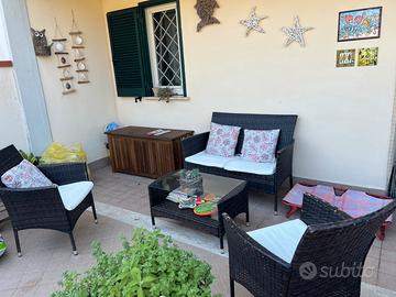 Set divano in simil rattan con due poltroncine e tavolinetto in vetro