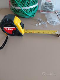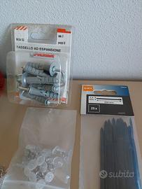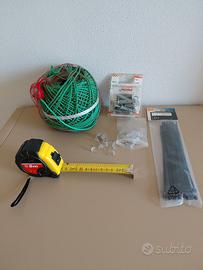 Set Ferramenta varia composta come segue: - 11 adattatori di cui 2 tripli - 1 bustina con piccole viti - 1 gomitolo fascetta in pvc ancora sigillato da giardinaggio - 1 confezione di 8 pezzi ancora sigillato di tasselli ad espansione con gancio medio 9 mm - 1 busta ancora sigillata di 25 pezzi di fascette stringicavo - 1 metro con nastro flessibile da 5 metri rifinito da blocco nastro