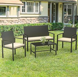 Set Giardino Esterno, Tavolo da Giardino con Sedie, Set Mobili da Giardino in Rattan PE Impermeabile, con 2 Poltrone, 1Divano Doppio e 1 Tavolino, Nero