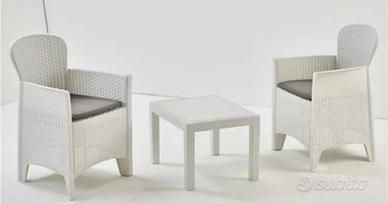 Set da giardino compreso di due poltrone con cuscini e un tavolino