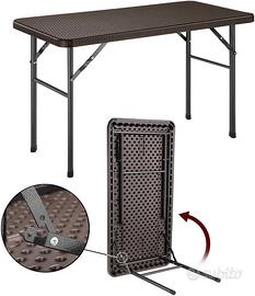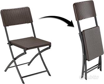 Vendo pratico set da esterno composto da un tavolo rettangolare richiudibile e 4 sedie pieghevoli coordinate. Materiale polyrattan e acciaio, con effetto legno e colorazione marrone scuro.