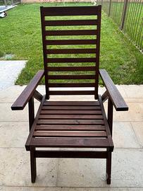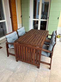 vendo set da giardino composto da 6 pezzi in legno serie Ikea Äpplarö: - 1 tavolo con 2 ribalte indipendenti 140/200/260x 78, h72 cm, con foro centrale per ombrellone; - 4 sedie con braccioli 49x49, h 41cm con cuscini; - 1 sedia reclinabile 63x80, h101cm; i pezzi sono in buone condizioni, mai esposti direttamente alle intemperie, trattati due volte con olio di semi di lino.