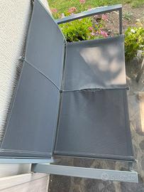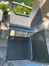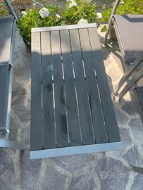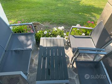 Vendo set da girdino composto da un tavolino, due sedie e una poltroncina. Presentano segni di usura, ma ben conservati. La poltrona come da foto e’ quella piu’ usurata.