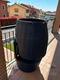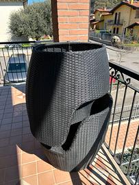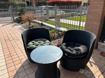 In rattan sintetico per esterno colore grigio scuro composto da 2 poltrone avvolgenti, con relativi cuscini, e un tavolino tondo il tutto tenuto bene e senza difetti e si possono impilare e risulta come una botte. Chiamate pure su WhatsApp al 347.0398260(Silvia). Prezzo un po' trattabile dopo visione, grazie.