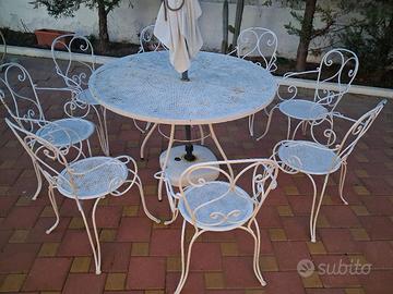 Set giardino vintage di colore bianco, formato da tavolo rotondo e 8 sedie. il tavolo. Presenta un foro al centro. Per eventuale inserimento di ombrellone. il set è in ottime condizioni strutturali. Ritiro di persona, no spedizione.