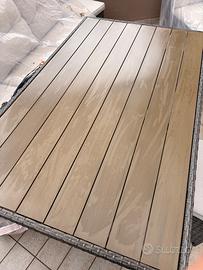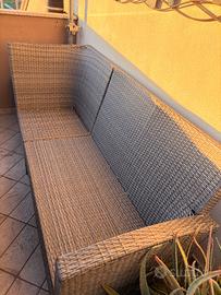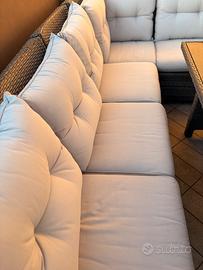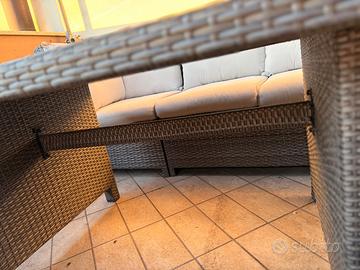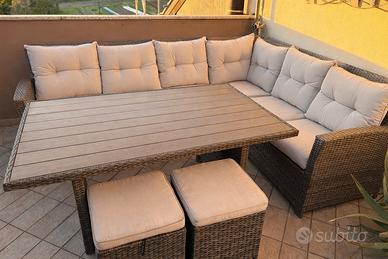 Il tavolo è stato già grattato e trattato con impregnante protettivo opaco, ma non uniforme. Può essere lasciato così oppure rifinito nuovamente a proprio gusto. La base, una volta grattata, rimane molto solida e resistente, essendo in legno composito (tipo WPC/legno pressato), ideale per esterno. Vendo bellissimo set da giardino in rattan sintetico di qualità, robusto ma flessibile (non rigido), quindi molto più resistente e duraturo nel tempo rispetto ai modelli economici (pagato 1200 euro). Il tavolo è stato già grattato e trattato con impregnante protettivo opaco, ma non uniforme. Può essere lasciato così oppure rifinito nuovamente a proprio gusto. La base, una volta grattata, rimane molto solida e resistente, essendo in legno composito (tipo WPC/legno pressato), ideale per esterno. Set completo ideale per terrazzi grandi o giardini: ✔ Divano modulare (3 elementi) configurabile a piacere ✔ Tavolo grande coordinato ✔ 2 pouf inclusi Comodità top: cuscini spessi e confortevoli, resistenti alle intemperie •Sedute sfoderabili (facili da lavare) •Cuscini da schienale non sfoderabili ma tessuto lavabile Condizioni: Struttura e cuscini in ottime condizioni Tavolo solido, già trattato ma non uniforme come descritto sopra Misure: Divano a L: 250 x 190 cm Profondità: 70 cm Altezza: 90 cm Tavolo: 155 x 95 cm Altezza: 67 cm Set molto scenico e completo, perfetto per creare una zona relax elegante all’aperto. Munirsi di furgone – solo ritiro a casa. Valore iniziale 1200 Euro