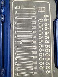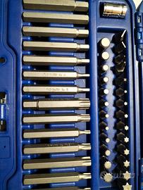 Set completo di chiavi torx ed esagonali di varie misure. Punte torx t20 t25 t27 t30 t35 t40 t45 t50 t55 t60. Punte esagonali h4 h5 h6 h7 h8 h10 h12. Punte aggiuntive m5 m6 m8 m10 m12. Inserti per avvitatori Custodia robusta marca norauto.