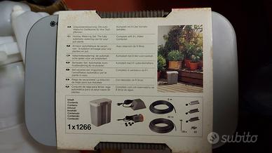 Marca Gardena art 1266 per irrigare con 3 differenti portate 15/30/60 ml/minuto fino 36 vasi . L' impianto si attiva in automatico una volta al giorno per un minuto e comprende: 1 serbatoio da lt 9 - 1 trasformatore con timer 14/230v - 1 pompetta sommersa - 3 erogatori a 12 uscite con differenti portate - 20 tappi - 1 tubo mt 9 - 1 tubo gocciolatore mt 30 - 36 picchetti