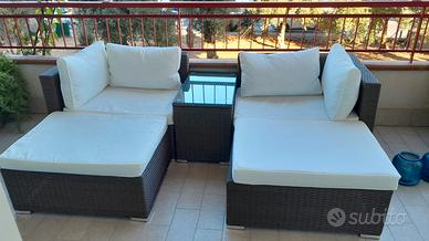 Set relax modulare composto da 5 pezzi (divano in due parti, 2 pouf e tavolino con top in vetro) in polyrattan tortora acquistato sul sito DEGHI