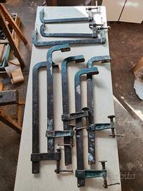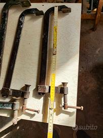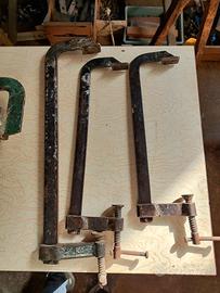 Tre morsetti (strettoi) professionali da falegname o carpentiere: due da 38cm e uno da 50 cm. In ferro pesante. In buono stato come da foto ma non usati da tempo. Disponibilità di un ulteriore set da cinque morsetti da 60 cm. (vedi ultima foto)