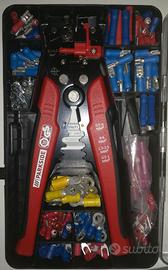 Attrezzo Multiuso per Spelatura, Taglio e Crimpatura di Cavi Elettrici 0.2-6mm² Set di 350 capicorda connettori a compressione terminali con attrezzo per spellare fili 3-in-1, pinze automatiche per spelare cavi, crimpatore automatico per terminali auto-regolante, resistente alla ruggine, antiscivolo, lega resistente all'abrasione, essenziale per elettricisti. Pulsante di Regolazione della Forza di Spelatura: Il pulsante regolabile permette di controllare la forza di spelatura. Ruotando il pulsante si ottiene la forza appropriata per un uso più comodo ed efficiente. --Intervallo di Dimensioni Applicabile:Spelafili da 10 a 24 AWG / 0,2-6 mm²; --Adatta per terminali isolati da 10 a 22 AWG / 0,5-6 mm² e terminali non isolati da 12 a 10 AWG / 4,0-6,0 mm², 16 a 14 AWG / 1,5-2,5 mm². --Peso pinza: 320 gr. --Dimensioni: 20,5L x 10,51 cm. --Materiale del manico: Elastomero termoplastico (TPE)