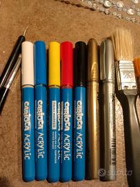 cofanetto ikea con colori acrilici in vasetti penne carioca colorate acriliche adesivi e vari pennelli. tutto usato poco,vendo per inutilizzo prezzo trattabile