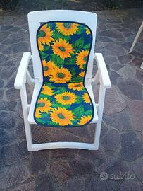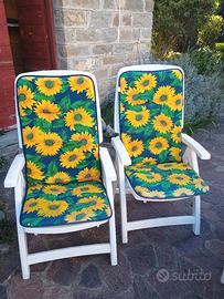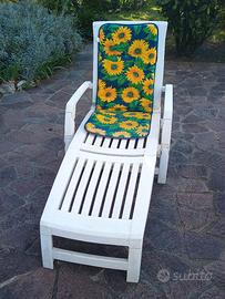 causa inutilizzo vendo IN BLOCCO 3 sedie pieghevoli e un lettino sempre pieghevole, usate ma in buone condizioni , il lettino e le due sedie hanno delle piccole incrinature riparate con colla bicomponente e sono assolutamente utilizzabili, meccanica a posto, il prezzo s'intende per tutto il set, compresi i cuscini delle sedie+due ricambi piccoli come da foto, ideali per giardino o terrazzo