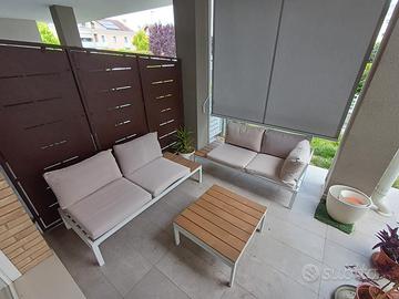Set composto da tavolo centrale 64 per 70 e due divani laterali 155 per 70