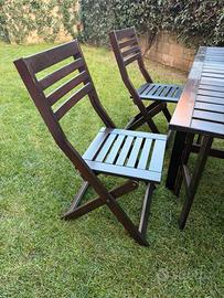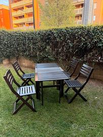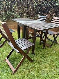 Vendo set composto da tavolo e quattro sedie in legno da esterno (giardino/balcone/terrazzo) richiudibili. Il tavolo può essere chiuso a battente da entrambi i lati diventando una piccola consolle, le sedie chiuse occupano pochissimo spazio. Marca Ikea, condizioni buone, riverniciato nel 2025. Ritiro a Novate Milanese. No spedizione.