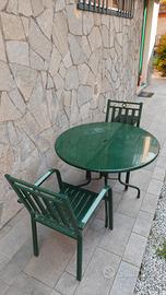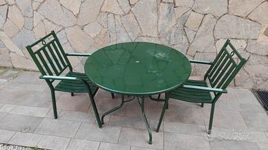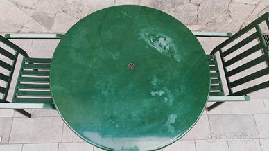 Vendesi bellissimo set da esterno composto da un tavolo tondo e due sedie coordinate, ideale per giardini, portici o ampi balconi. Il set è realizzato in solido ferro battuto/metallo di ottima qualità, molto robusto e stabile, caratterizzato da una classica colorazione verde scuro che si integra perfettamente nel verde del giardino. Caratteristiche principali: Dimensioni Tavolo: Diametro 1 metro (ideale per merende o rinfreschi fino a 4 persone). Sedie: 2 sedie con braccioli, design a doghe, ergonomiche e resistenti. Dettagli: Il tavolo è predisposto con foro centrale per l'ombrellone. Stato: Il set è in ottime condizioni strutturali. Presenta normali e segni di usura del tempo (come visibile in foto) che non ne compromettono la stabilità, ma ne testimoniano l'autenticità e la solidità. Un set indistruttibile rispetto ai moderni prodotti in plastica, perfetto per chi cerca qualità e durata nel tempo.