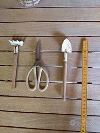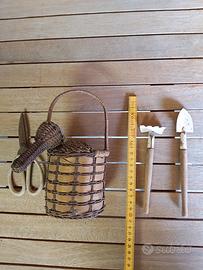 Il rastrello e la vanga presentano manico in legno e parte bianca in metallo, imbuto interamente in vimini e forbici in ferro