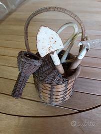 Splendido cestino vintage in vimini con attrezzi da giardinaggio in miniatura