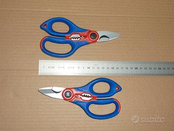 La forbice è dotata di fondina da cintura appendibile, ha lama seghettata inox e impugnatura in polipropilene gommata, asola taglia cavi fino a 50mmq, asole per spellare fili 1,5/2,5/4mmq, crimpatrice per 2,5mmq, lung. 164mm, peso 130g,