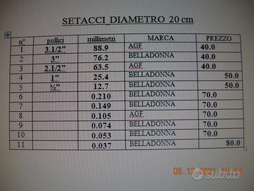 Setacci da laboratorio usati in per analisi granulometriche, senza nessun danno o buchi nella superficie. Sono disponibili quelli in elenco allegato; senza filo di ruggine. Per chi interessato è una vera occasione visto anche quanto costano nuovi.