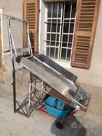 Vendo per cessata attività questo prototipo artigianale per pulire le nocciole. Non ha meccanismi rotanti, funziona manualmente sfruttando il piano inclinato, basta caricare nella tramoggia il materiale raccolto a terra, passarlo con una mano in senso rotatorio e ribaltare le foglie. La nocciola cade dalla tramoggia e rotola sulla rete inclinata finendo nel contenitore completamente pulita. Fidatevi lo uso da 15 anni e funziona perfettamente riducendo a 1/3 il tempo impiegato per la raccolta. L'articolo si trova in provincia di Asti per vederlo senza impegno cont. su W.A.