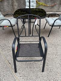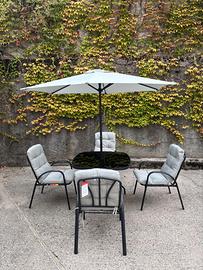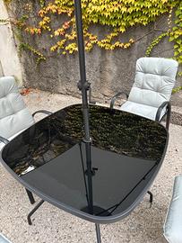 Set tavolo + 4 sedie con cuscino + ombrellone. Tavolo quadrato 90 X 90 X h 74 tubolari Ø mm 24, piano d’appoggio in vetro temperato spessore mm 5 nero, struttura tavolo, sedie e ombrellone in acciaio verniciato a polvere colore antracite (finitura opaca), Sedia cm 71 X 54 X h 88.5, sez. gambe cm 38 X 21, tessuto cuscini poliestere g 170/m² grigio chiaro, spessore cm 6. Ombrellone Ø cm 200 (6 Stecche), palo Ø mm 32, apertura/chiusura con manovella, tessuto poliestere g 150/m² grigio.