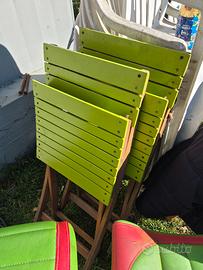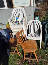 Due sgabelli con seduta in ecopelle, due sedie in legno, due sedie pieghevoli con doghe, 14 sedie in plastica da giardino, 1 sgabello stile industrial bianco in piu regalo due tavolini in plastica . Tutto a 100 euro