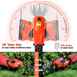(Super Power): dotato di un potente motore e batteria agli ioni di litio da 2000 mAh, le forbici per erba a piena carica mantengono circa 100 minuti e produce una velocità a vuoto di 1100 giri/min, che consente di falciare rapidamente prato e siepi