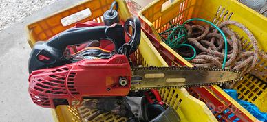 Non è mia, appartiene ad un conoscente anziano. La motosega va in moto ma ha problemi di frizione (gira sempre, ed è pericolosa da accendere quindi). Numerosi pezzi nuovi = 2 bobine nuove (prezzo 75 euro l'una) per cui prezzo non trattabile Carter accensione nuovo non originale (25 euro) Candela nuova (10 euro) Molle frizione nuove (15 euro) 2 catene messe discretamente. Il prezzo è tale solamente per recuperare almeno in parte il costo delle due bobine. Identica a Echo 2511