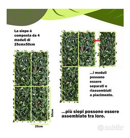 Siepe sintetica usata una stagione invernale in ottime condizioni, alta qualità marchio STI "si trova su Amazon con ottime recensioni" molto bella e folta non scolora al sole. disponibili 6 mq, 48pz pannelli a incastro 25cmx50 per poterla adattare al meglio in base alle proprie necessità e misure. Vendo a metà prezzo solo in blocco ritiro a mano non spedisco.
