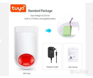 Sirena per allarme casa wifi da esterno PST con allarme sonoro e lampeggiante garantisce protezione e allerta il vicinato in caso di effrazione o emergenza lanciata dall'utente. Può essere usata da sola con attivazione allarme da app in funzione SOS antipanico, in abbinamento ad una centralina d'allarme o può fungere essa stessa da centrale del sistema di allarme in quanto si collega ad altri dispositivi wireless a 433 Mhz, sensori (max 24) e telecomandi (max 10). I sensori da abbinare devono lavorare sulla stessa frequenza per funzionare. Allarme sonoro a 120 db. È un deterrente per ladri alla semplice vista. Controllo da app gratuita Tuya Smart, attivabile da remoto in caso di emergenza e come antipanico, controllo vocale mediante Amazon Echo e Google Home. Avvisi alert su smartphone in tempo reale, con possibilità di inviare anche sms e telefonata. Facile installazione, non richiede competenze specifiche - user friendly. Compatibile con sensori di movimento, sensori porta finestra, sensori di fumo/gas/monossido di carbonio. Doppia alimentazione, elettrica e con batteria ricaricabile inclusa. Funziona con wifi 2.4 Ghz ( 5G non supportato). Materiale ABS, montaggio a parete. Compreso nella confezione: Sirena, batteria al litio 3.7V ricaricabile, cavo di ricarica batteria, manuale istruzioni. Grado di protezione da agenti atmosferici IP65.