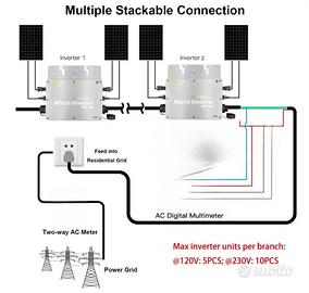 Vendo n2 microinverter da 700w collegabili tra loro o utilizzabili separatamente ( collegabili 4 pannelli solari da 400w ) con cavo di collegamento shuko alla presa domestica + presa smart per accensione e spegnimento da remoto e controllo produzione .