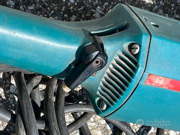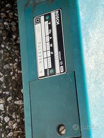Smerigliatrice angolare professionale Bosch, un modello di grandi dimensioni progettato per lavori pesanti come il taglio di metallo o pietra. Potenza da 1800W, tipica di queste serie professionali. Disco: Supporta dischi con diametro fino a 230 mm. Corpo in plastica blu/verde acqua con la classica striscia rossa Bosch e protezione metallica per il disco. Alimentazione: Modello a filo con cavo di alimentazione gommato e spina standard. Dati tecnici: (modello 1322.4), identificata dal codice prodotto 0 601 322 450. Specifiche Tecniche Principali Tensione: 220 V Frequenza: 50/60 Hz Corrente: 8,6 A Potenza: 1800 W Velocità: 6500 giri al minuto (/min) Origine: Prodotta in Germania (Germany 082)