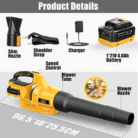 Soffiatore a Batteria NUOVO SIGILLATO 21V Soffiatore Foglie Elettrico con 1 Batteria da 4,0Ah, 3 Velocità Regolabili, 2 Ugelli, Tracolla per Foglie, Neve, Polvere e Detriti Vendo a mano a Roma o spedisco 【Motore potente e prestazioni di soffiaggio eccezionali】Il soffiatore a batteria JYGMPRO è dotato di un motore ad alte prestazioni che fornisce una potente velocità del flusso d'aria fino a 240 km/h e un volume d'aria di 3,6 m³/min, garantendo che questo soffiatore per foglie a batteria possa pulire efficacemente grandi quantità di foglie e detriti in giardino. Il rumore durante il funzionamento può essere ridotto del 20%, ideale per aree e proprietà sensibili al rumore. 【3 modalità di velocità regolabili】Questo soffiatore elettrico a batteria è dotato di tre controlli di velocità (bassa, media, alta). Cambia modalità in 1 secondo e controlla la potenza con precisione. 【Design leggero e senza fili】Con un peso di soli 2,8 kg, questo soffiatore a batteria consente un funzionamento senza affaticamento grazie all'impugnatura ergonomica antiscivolo per un maggiore comfort. Inoltre, è dotato di una tracolla per alleggerire il carico sulle mani. Il design staccabile lo rende più facile da riporre e comodo da trasportare all'aperto. 【1 batteria da 4,0 Ah per una lunga autonomia】 Il soffiatore foglie a batteria è dotato di una batteria da 4000 mAh e di un caricabatterie, che gli consentono di funzionare ininterrottamente fino a 30 minuti in modalità a bassa velocità. Sul retro della batteria sono presenti 3 spie luminose che consentono di conoscere sempre la carica residua. 【Facile da montare e utilizzare】 Il nostro soffiatore per foglie è facile da montare: basta colle