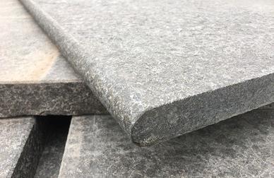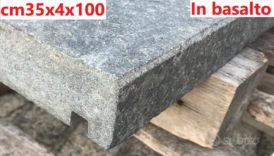 In basalto nero, cm 35xsp.4x100, il piano e le 2 coste sono fiammati, spazzolati e bisellati, con 2 gocciolatoi.