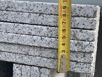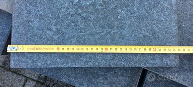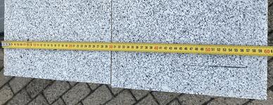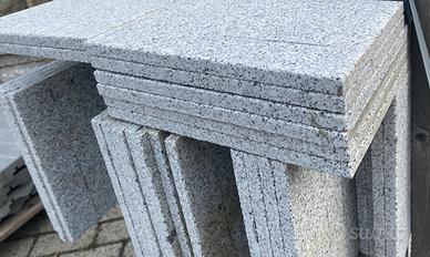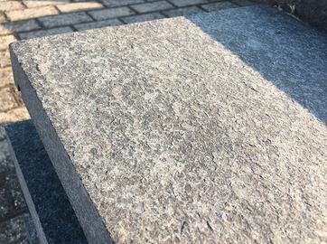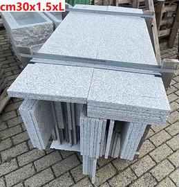 In granito grigio chiaro, cm 30 x 1.5, con 2 lunghezze: 93.5 e 122 cm, il piano è granigliato, i bordi a taglio sega: