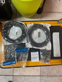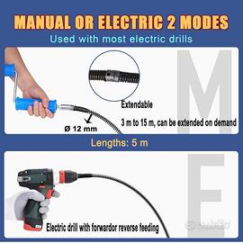 Sonda Sturatubi composta da 2 spirali da 5 metri che si possono unire, diametro 12 mm, con 6 accessori di testa di taglio per la pulizia dei tubi e 1 adattatore manuale e 1 adattatore elettrico per trapano.