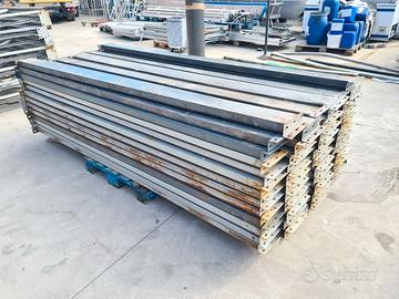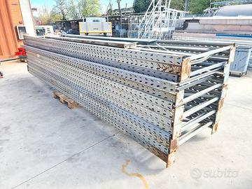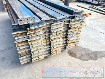 spalle e correnti zincati per scaffali pallet usate, si tratta di una struttura utilizzata per lo stoccaggio di merci e materiali su pallet in ambienti come: magazzini, depositi, capannoni, etc. di marca Ponteggi Dalmine. disponibilità di spalle e correnti: - 287 correnti lunghi 180X20cm sp.4cm, sezione 10cm - 15,00€ cad. iva esclusa - 84 correnti lunghi 270X20cm sp.4cm, sezione 10cm - 21,00€ cad. - 13 spalle 496X100cm - 65,00€ cad. vendita in blocco a 6.000,00€